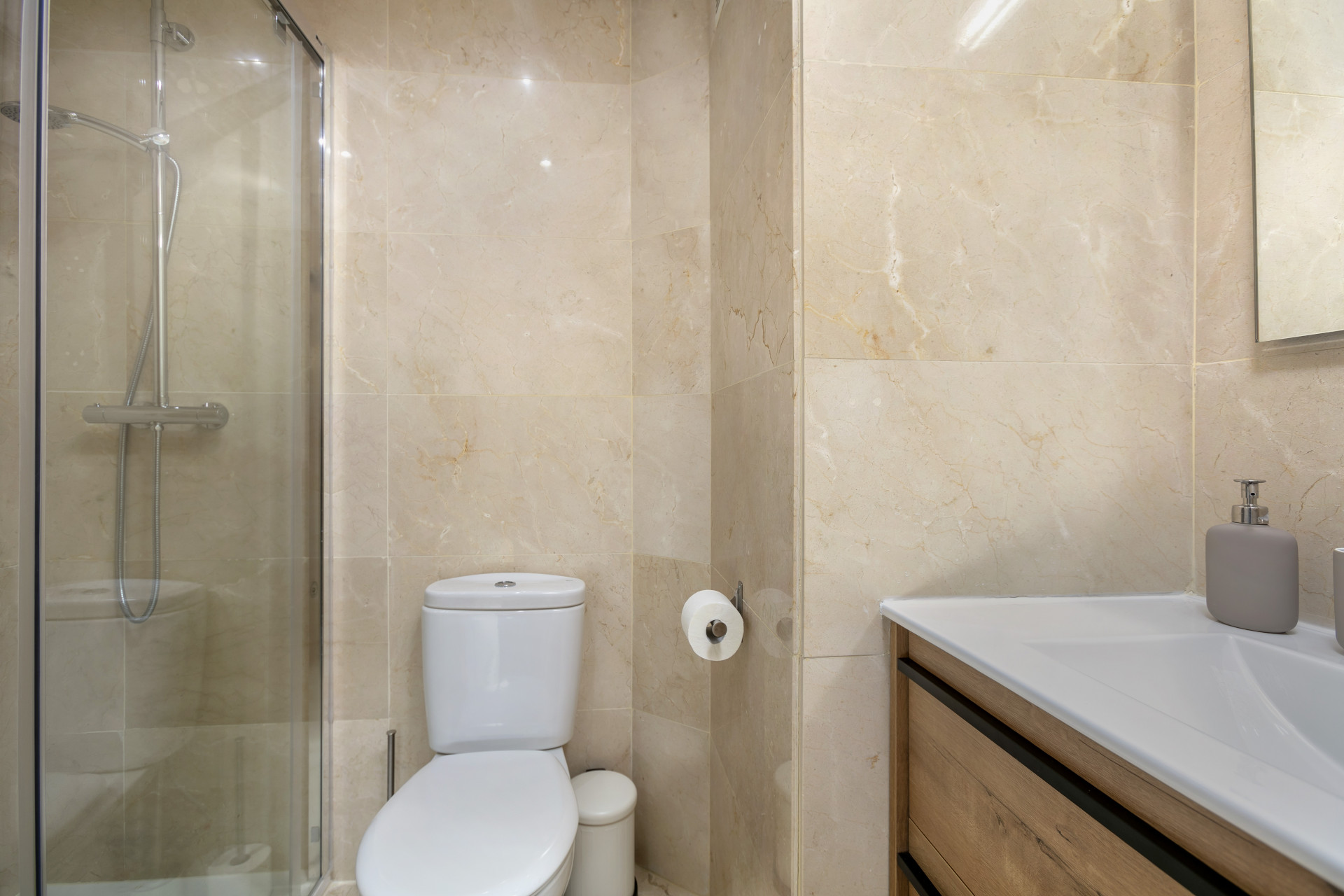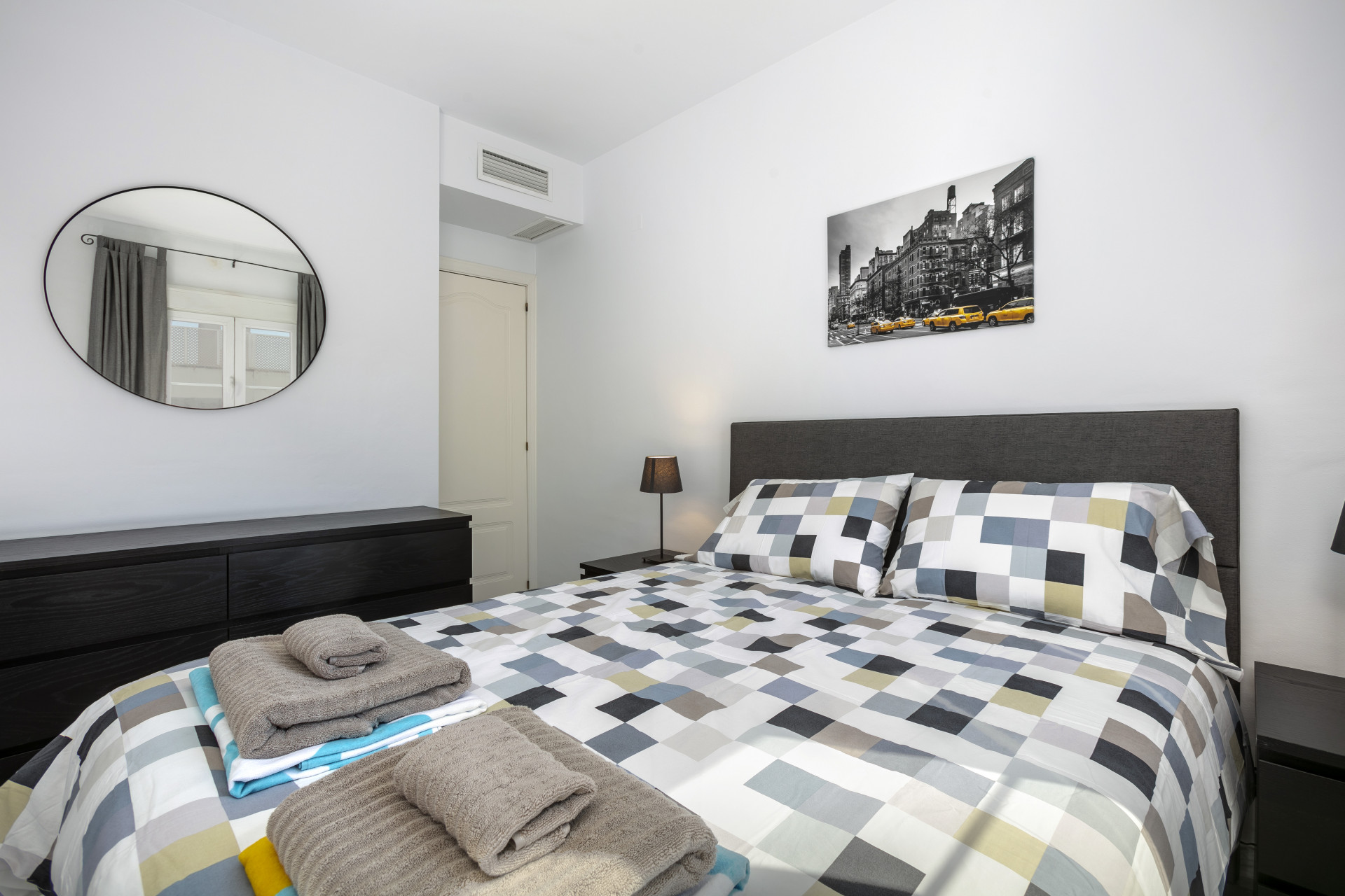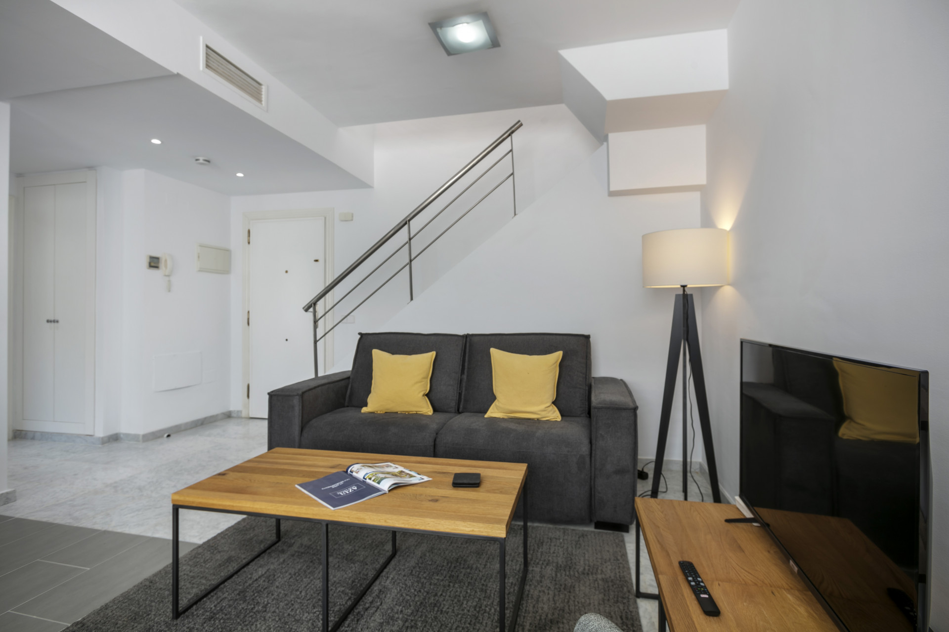 El apartamento consta de un salón abierto, cocina y comedor, con muebles y electrodomésticos nuevos. Todo el espacio es luminoso y abierto, perfecto para socializar y relajarse con la familia en los cómodos sofás y sillones, o en el comedor con vista al mar. El pasillo te lleva al dormitorio principal con cama king size y un amplio baño con ducha a ras de suelo.